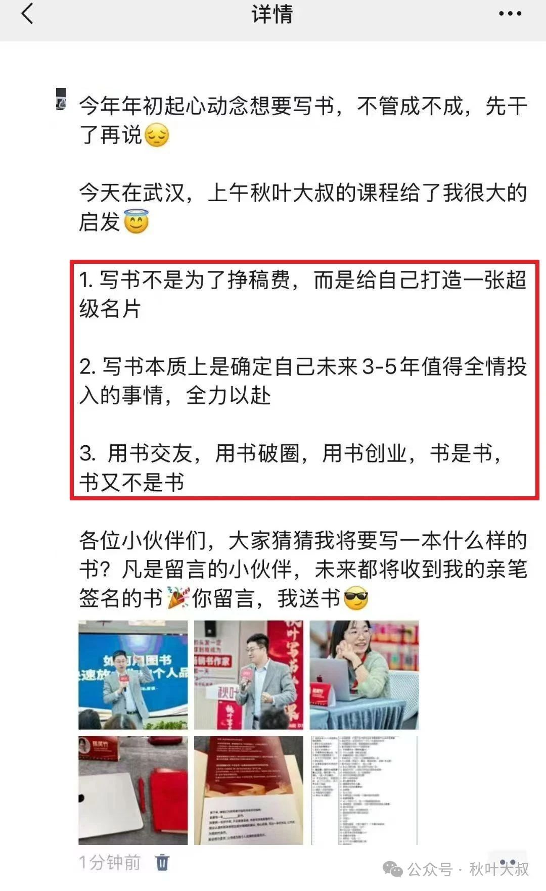 “秋叶写书私房课让我明白:回归内核,踏实积累、深度思考、勇敢书写。通过一本书,确立真正的价值根基。”